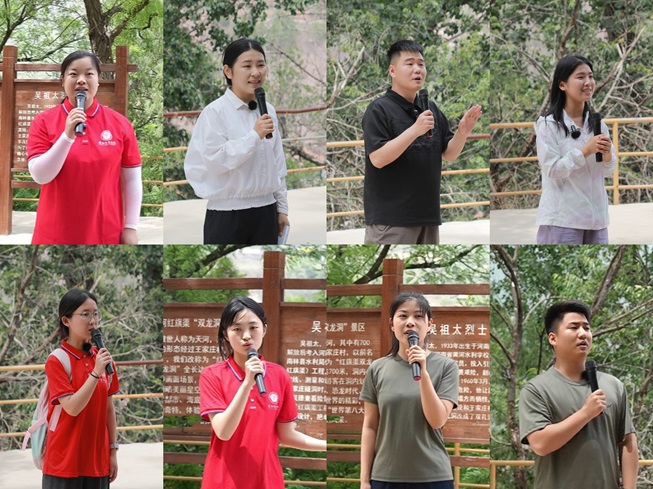 在王家庄“双龙洞”隧道旁,红旗渠总设计师吴祖太的牺牲地,辅导员、青马学员、退役在校大学生代表结合学习、工作分享感悟体会。
