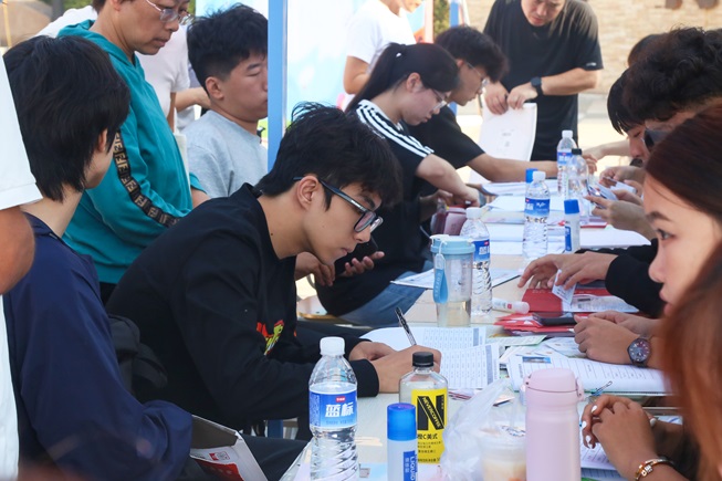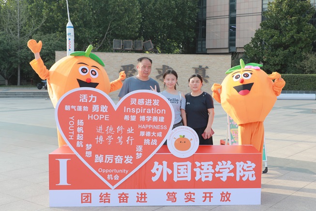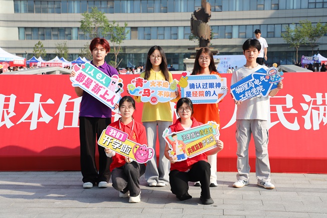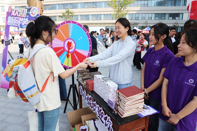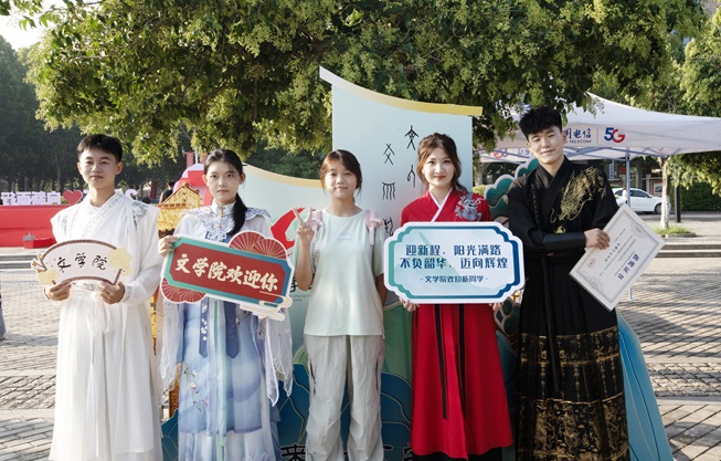 文学院志愿者身着飘逸汉服,向新生递上秋水文学社最新期刊,纸页墨香中传递文脉温度,还邀请新生参与投壶游戏,一同体验“礼乐射御”的古风雅趣;物理与电气工程学院将新生名字汇聚融合成“我爱物电”的字样,字里行间满是对新生的欢迎与期许;外国语学院设立了家长休息区,吉祥物“大橙子”在报到点迎接新生,志愿者们在家长休息区耐心解答疑问,并全程引导新生办理入学手续;资源环境与旅游学院设置了时光邮箱,供新生写下寄语送给四年后的自己,等待毕业那天重启这份“时光礼物”;传媒学院的“幸运转盘”人气满满,转动的指针不仅为新生送去定制好礼,更载着对新生的美好期许……